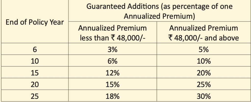 | Minimum Policy Term | Premium Less Than Rs.48,000 – 15 years Premium more than Rs.48,000 – 10 years |