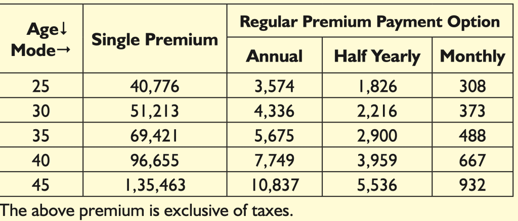 | Premium Paying Term – Regular premium Payment | same as policy term | same as policy term |
