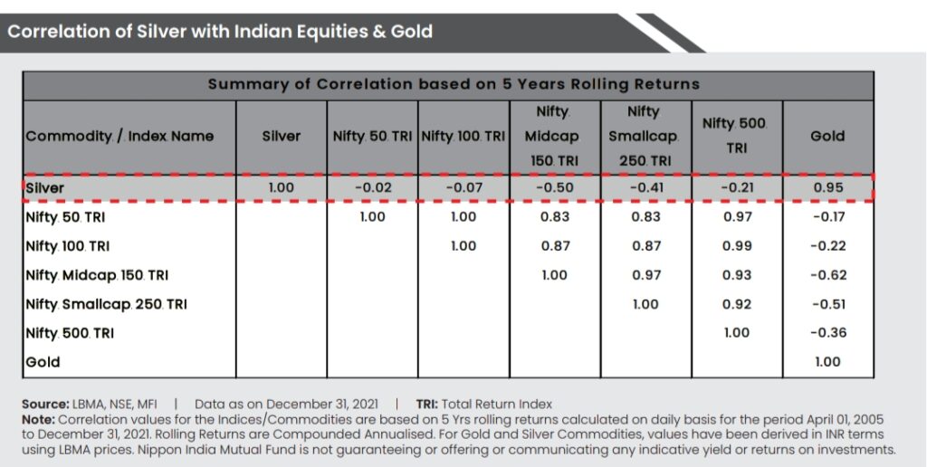 - It is evident from history itself – that equity indices and silver or other commodities have a negative correlation with each other. This also means, in a declining equity market the performance of silver or other commodities is better. Hence investing in silver ETF FoF can provide you with a hedge against volatility.